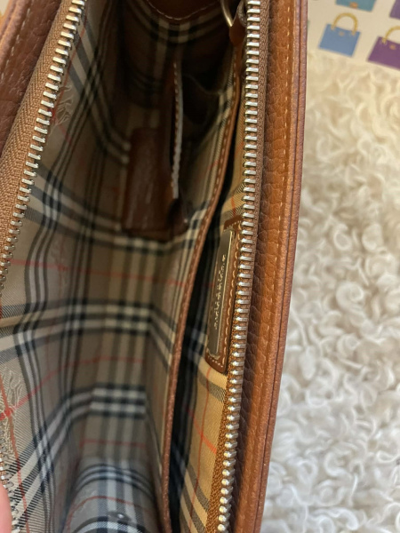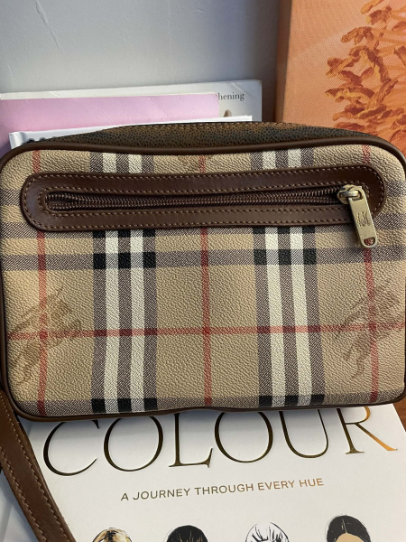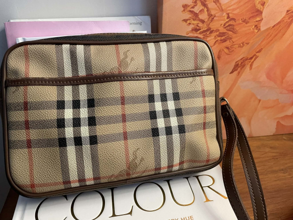 Authentic Burberry crossbody bag featuring the iconic Haymarket/House Check pattern in classic beige with red and black accents, complemented by brown leather trim.